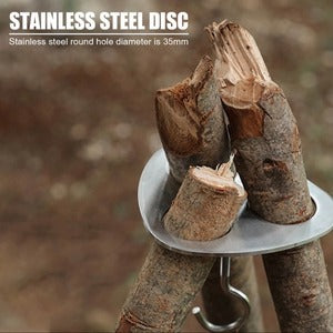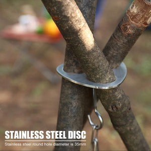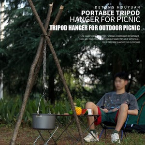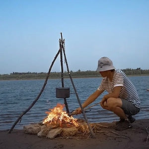 自作のトライポッドハンガーを掛ければ鍋やケトルを吊るして